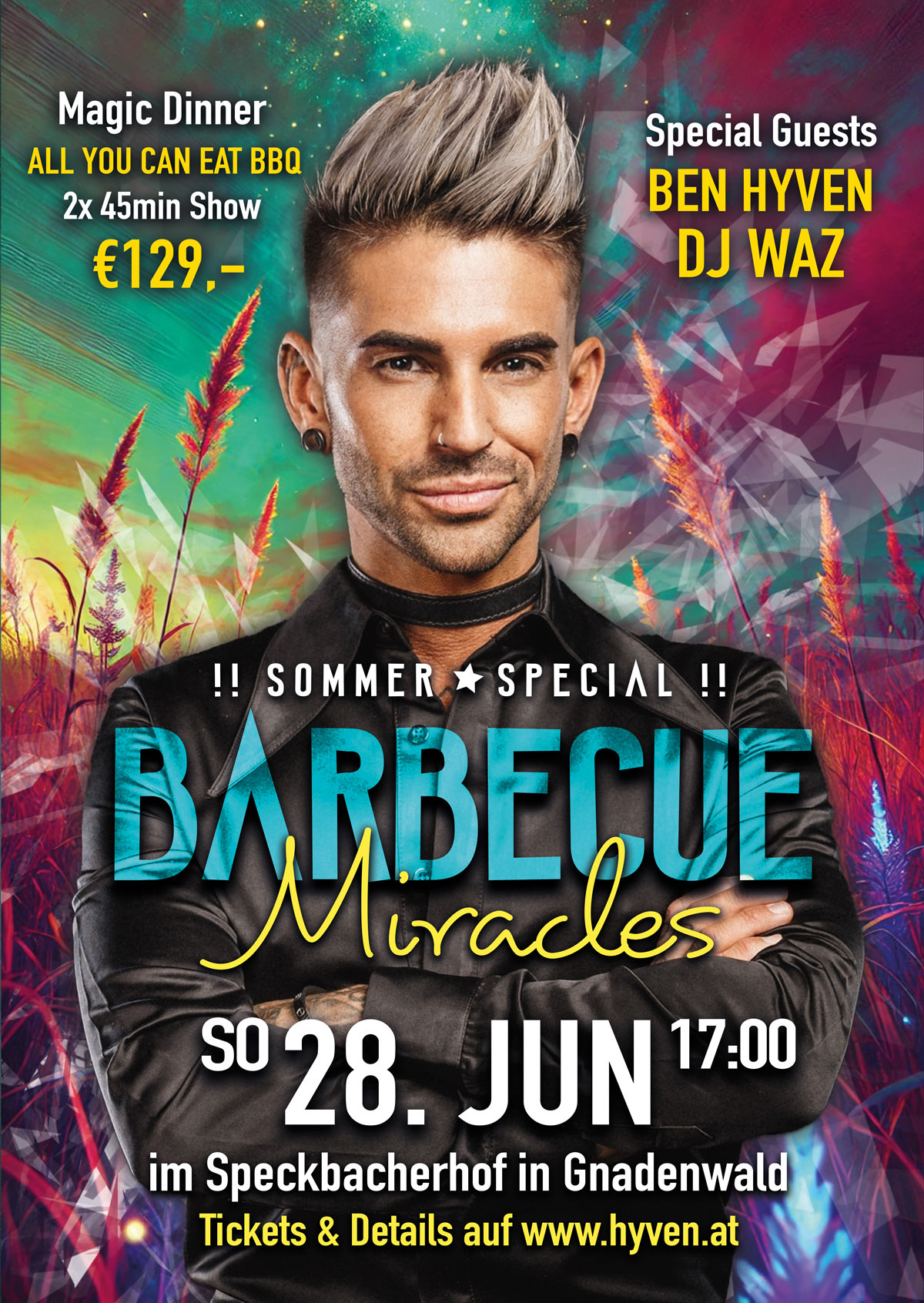 All You Can Eat BBQ mit Aperitif, Fingerfood sowie großem Salat- und Vorspeisenbuffet – zubereitet von Andreas Hofmann und Team. Sundowner und entspannte DJ-Vibes by DJ WAZ. Ben eröffnet den Abend mit Close-up-Magie an den Tischen; nach dem Hauptgang folgt eine 90-minütige Open-Air-Show. Zum Abschluss Dessert – und falls das Wetter kippt: Dach zu, Magie bleibt.